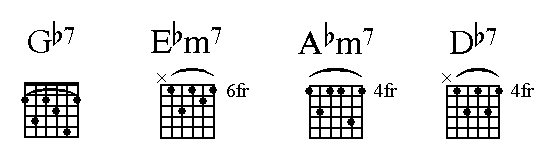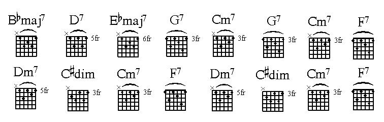 The tempo for this example is fairly fast at 180 BPM. The chord progression is I-VI-II-V progression commonly known as "rhythm changes". Rhythm changes does not actually refer to a change in rhythm but to the song "I've Got Rhythm" which used the same chord progression. This progression is also a common turnaround pattern.