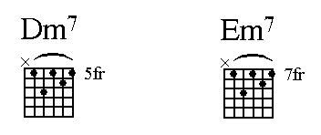 Chord progressions vary as to how many chords are in each bar. Jazz trumpeter Miles Davis was one of the first to write tunes which stayed on the same chord for many bars. This creates a relaxed feel and is known as a modal tune. Example 32b stays on Dmin7 and moves briefly to Emin7 to break it up a little. Notice the bass line under this example as you may need to play additional bass notes if playing solo jazz guitar. A walking bass line gets its name from the predominantly quarter note driven groove that feels like it walks through the progression. Harmonically a walking bass line plays the root note of each chord then uses scale and chord notes to move around the progression to the root note of the next chord. Preceding the root notes of each chord with notes a semitone above or below (or using other leading notes) provides a logical sense of forward motion to the bass line. As this is improvisation, it's your choice which notes you use.