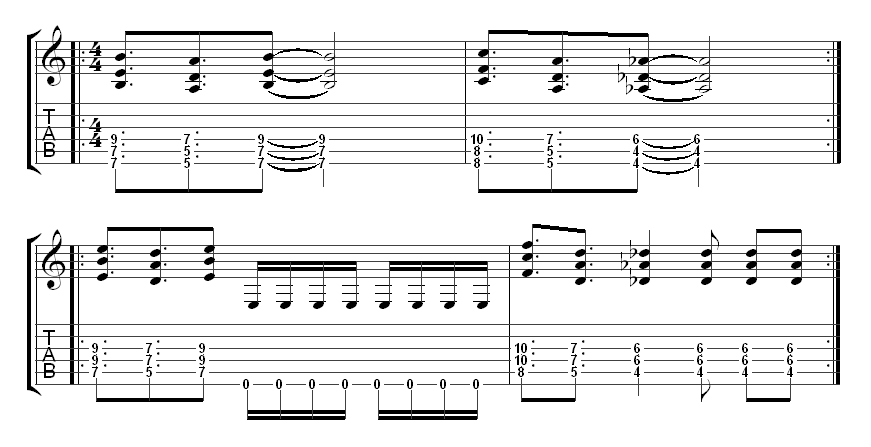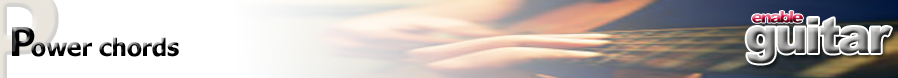 Power chords are small chords with a big sound. The are usually played with an overdriven tone and often use the palm muting technique. They are basically small barre chords using fewer strings. Power chords use the root note, the fifth and sometimes the octave. (The octave can easily be added as your little finger is already covering that note on the D string). This means that power chords are neither major or minor. They function as a way of giving single note riffs a bigger sound following the same pattern. The basic power chord shape becomes even easier when using a drop D tuning where your bottom E string is lowered to a D. The same three notes can then be held with one finger. Some bands tune all of their strings down so that the sound is lowered but the shapes remain the same. You can detune your guitar by various amounts and even use heavier gauge strings to help keep the tension from getting too loose. Power chords are usually written as C5 (C and G), D5 (D and A) and so on.