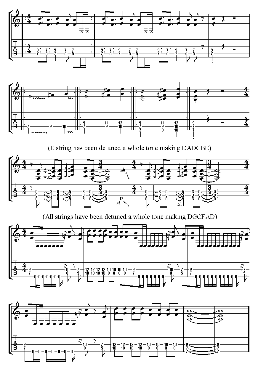 These power chords sound particularly heavy because the lowest notes (on the E string) are actually not the root notes but the 5th an octave lower. This make the chord progression E D E F D C# as the root notes are actually on the A string.