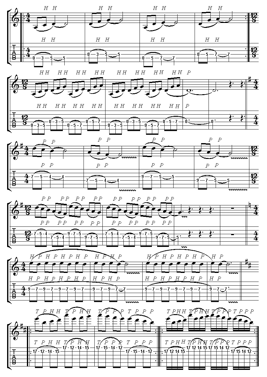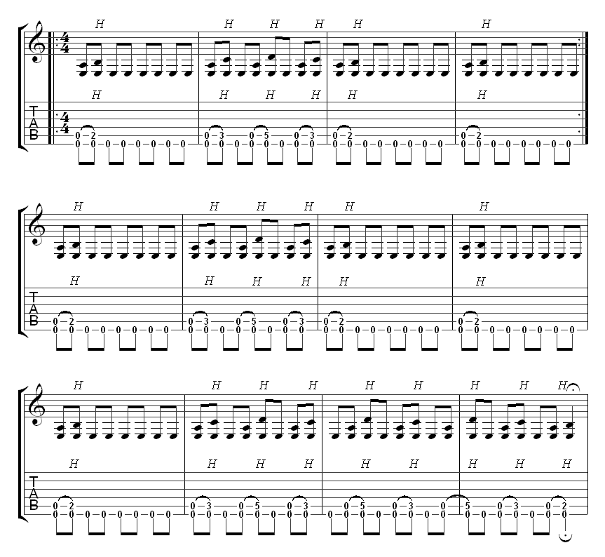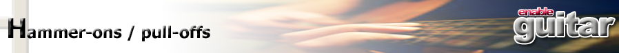 Hammer-ons are notes which are produced by the left hand hitting a fretted note without the need for it to be played with the right hand. This should be done firmly for the note to have comparable volume to a normal note. All hammer-ons are fretted notes but the notes which precede them may be open strings or other fretted notes. A pull-off is like a hammer-on in reverse. Pull-offs are notes which are produced with the left hand pulling off which sounds whatever note is below it without the right hand having to play the string. Lifting the left finger off produces hardly any volume. A pull off involves pulling or flicking the string as you take your finger off. Hammer-ons and pull-offs are known as slurs in classical terminology and are also a component of the finger-tapping technique.