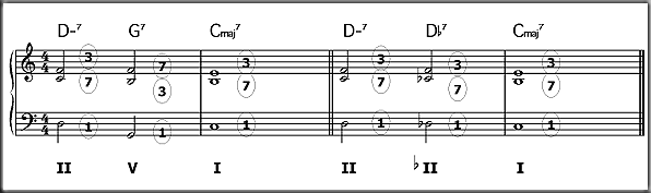 The example below shows a II, V, I progression with shell voicings and how the tritone substitution of the V chord to a bII could work as G7 gets substituted with a Db7. This is a great idea to use to create interesting alternatives to a II, V, I progression in any key. Try these out and then transpose them into other keys to get acquainted with other possibilities you could add to tunes that have this type of progression contained in them. This is commonly used by jazz musicians to reharmonise an old standard and give it new life.