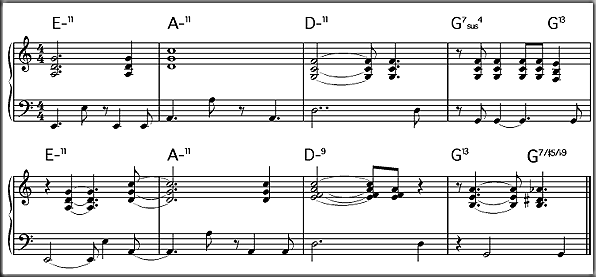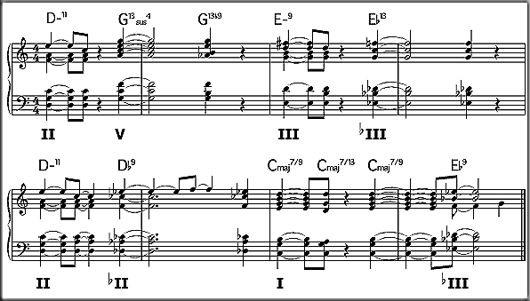 The following example gives us a glimpse of how a pianist in a Jazz combo might comp through a chord progression using tritone substitutions, 4ths voicings and other commonly used voicing ideas. In bars 3 & 4 you'll see an Eb13 chord with the description bIII underneath it. This is a tritone substitution for the VI chord of C major. The Em7 and Eb13 resemble a II, bII tritone substitute in D major. Bars 5 & 6 contains a tritone substitute of the V chord from C major (the key the piece is in). The last bar finishes with another Eb13 acting as a tritone substitute for the VI chord again, which if repeating back to the beginning resembles a tritone substitution of the V chord leading to the Dm11.